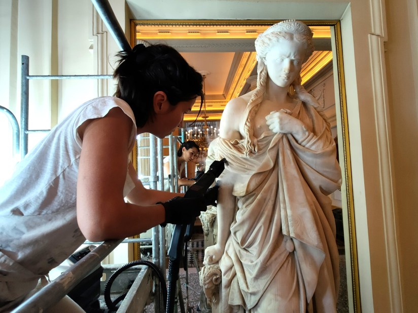 Décrassage vapeur et petites restitutions sur quatre statues en marbre conservées dans le foyer du théâtre de l’Odéon. En collaboration avec Julie Chanut.