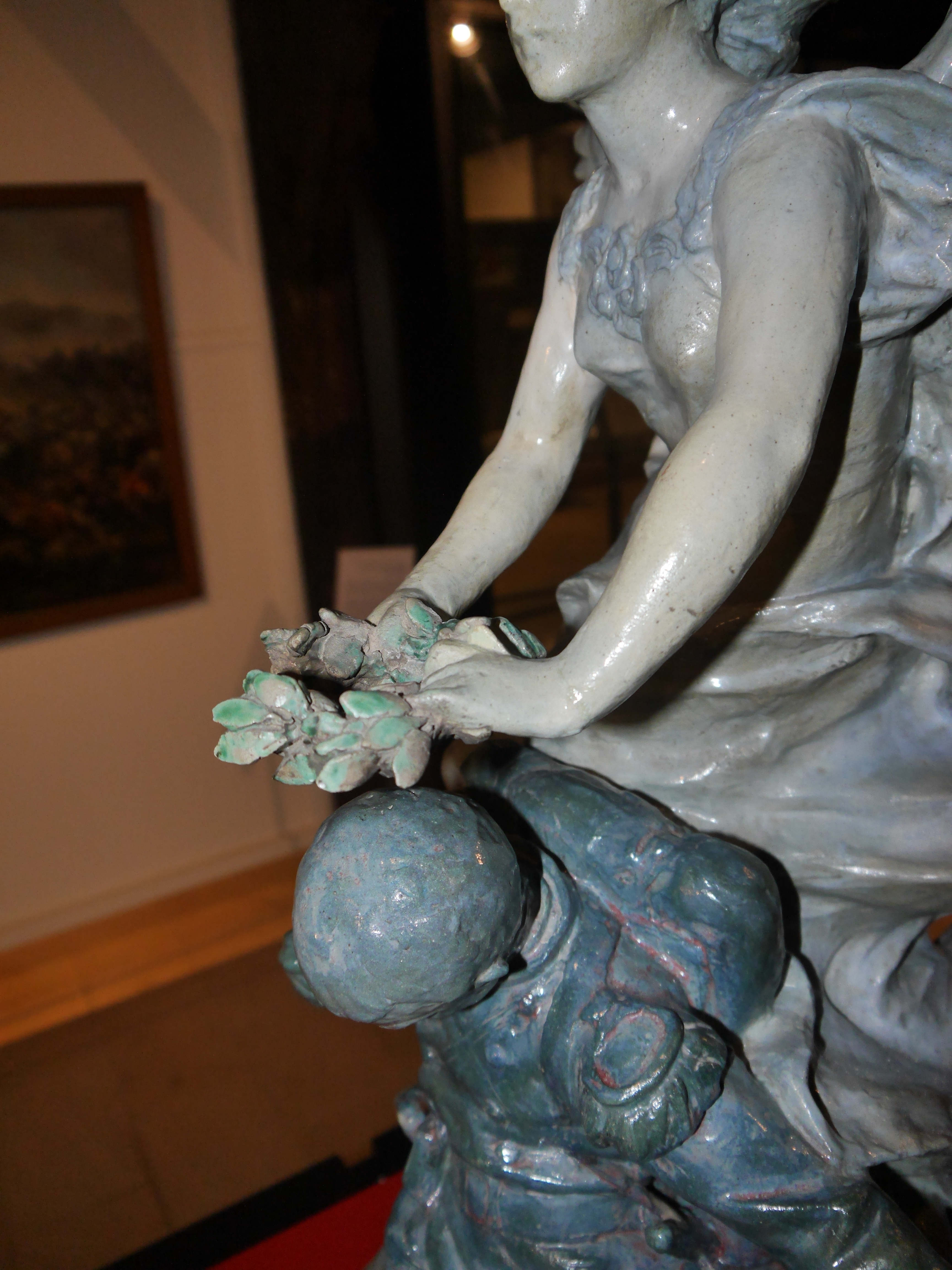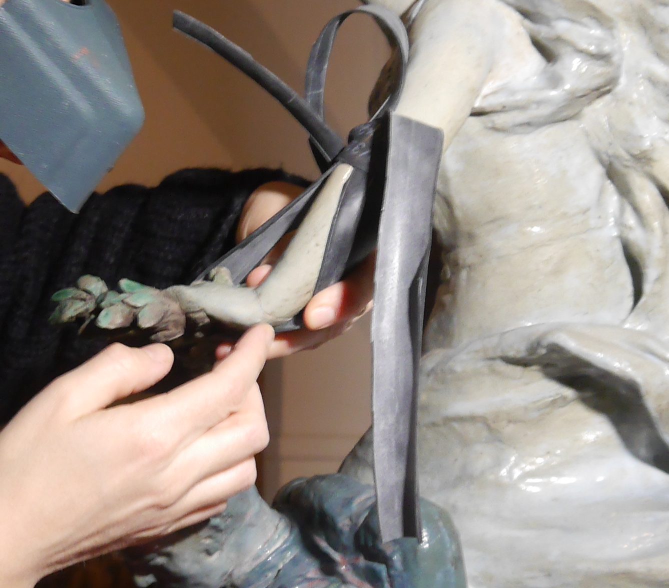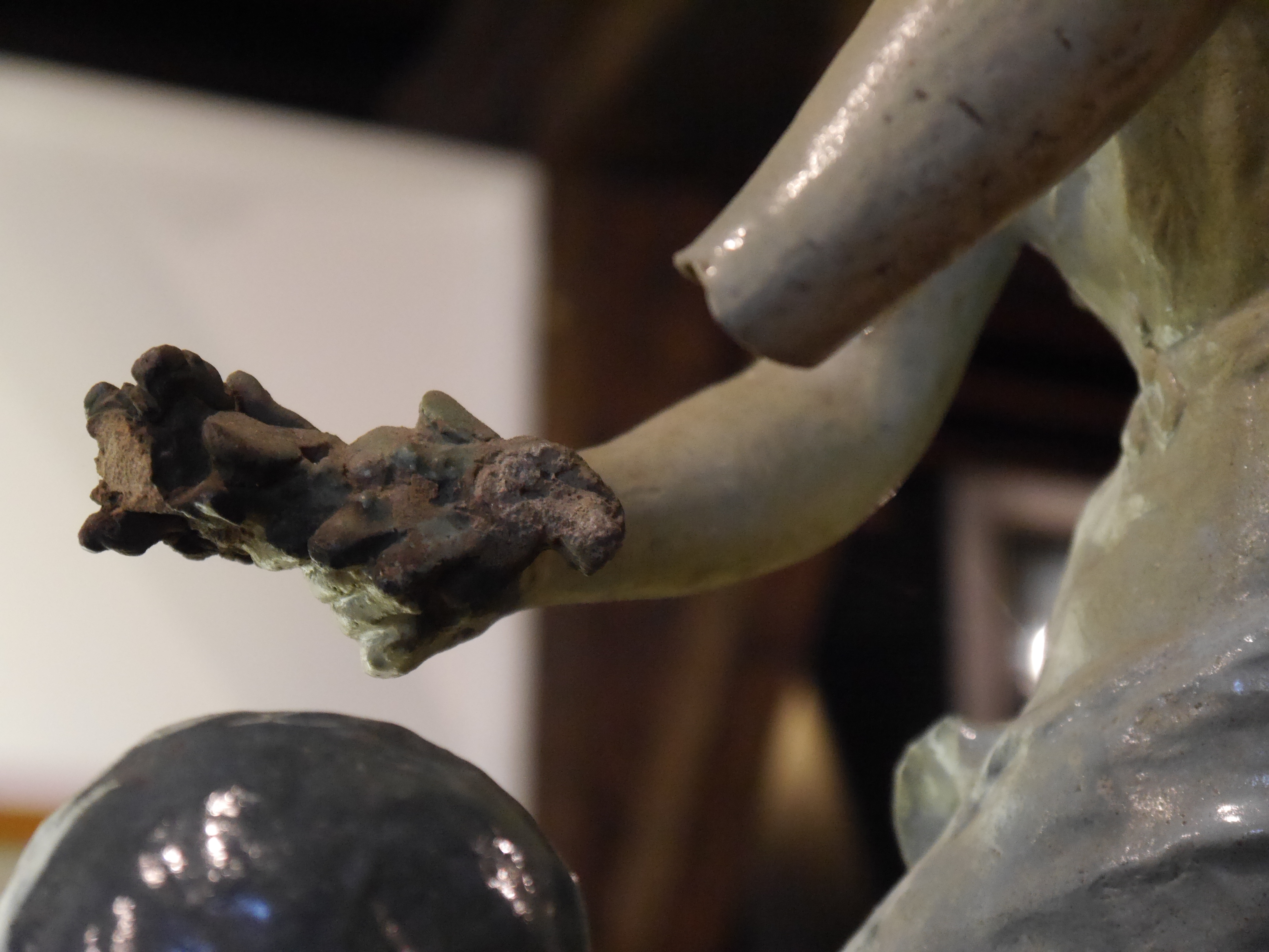 Réassemblage de la main et retouche illusionniste sur une sculpture en terre-cuite émaillée. En collaboration avec Julie Poitiers.